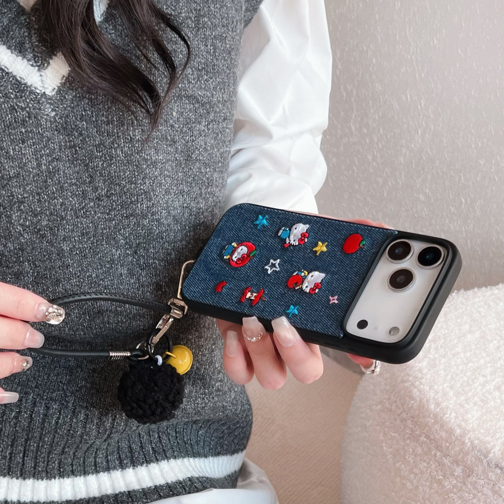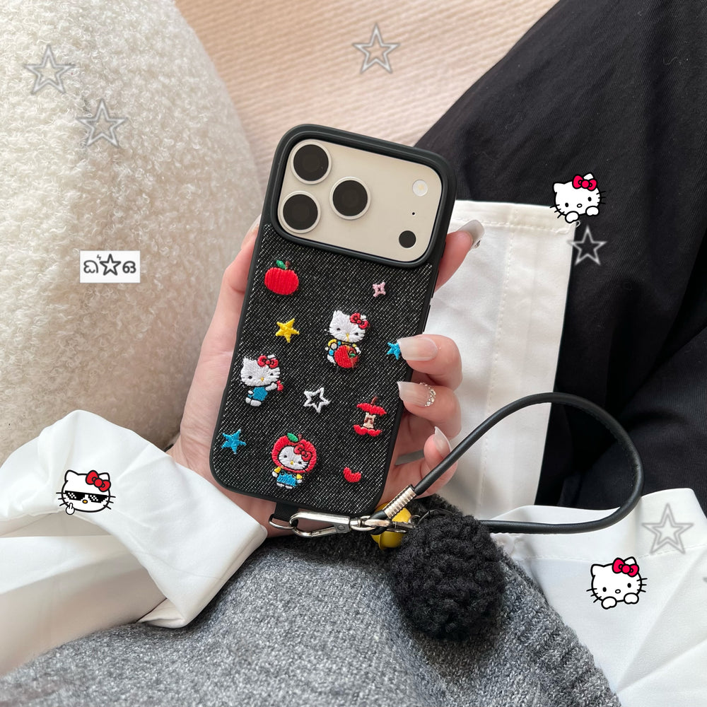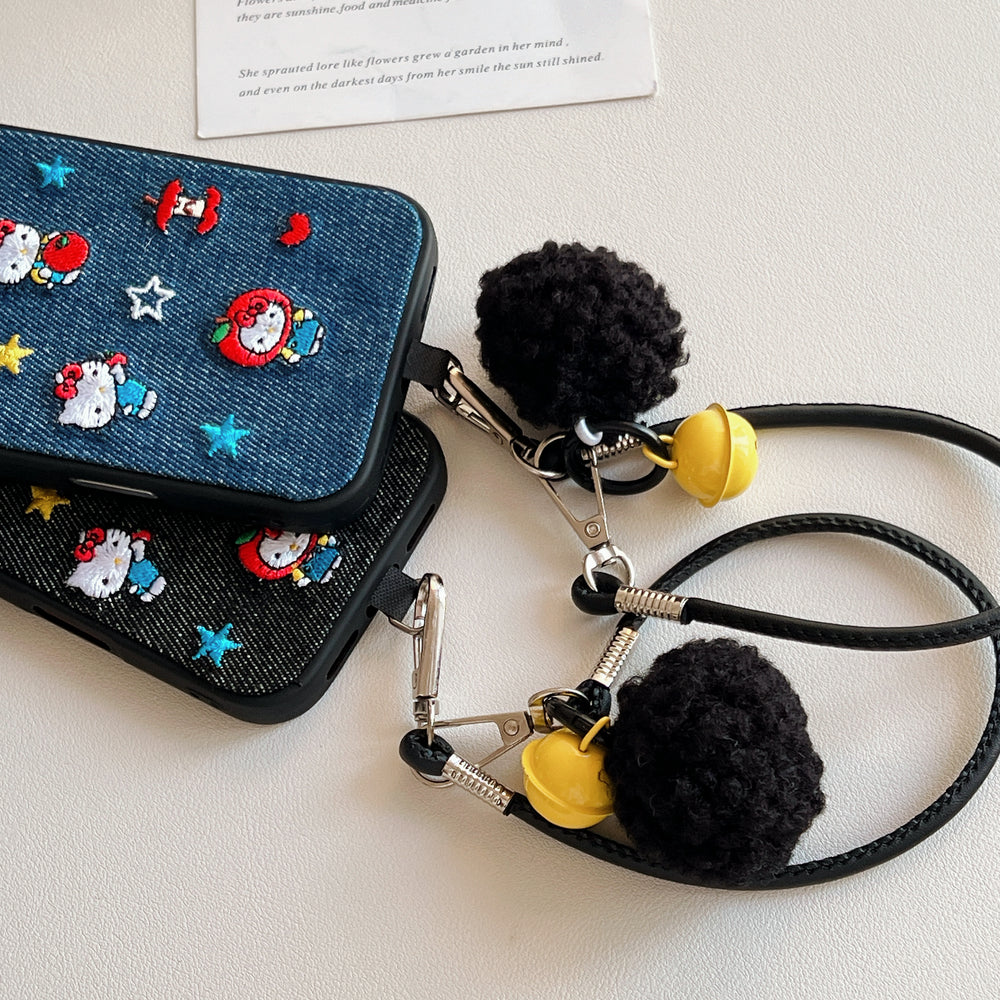 Blue and black Kitty embroidered denim phone case