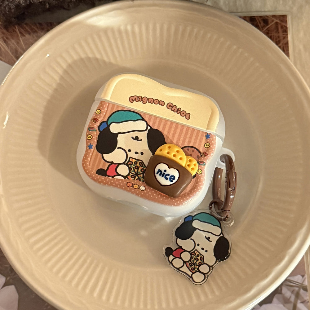 [Wave-shaped AirPods Earphone Cover] Translucent White 3D Biscuit Bag Dog + Brown Pizza Dog Hanging Ring