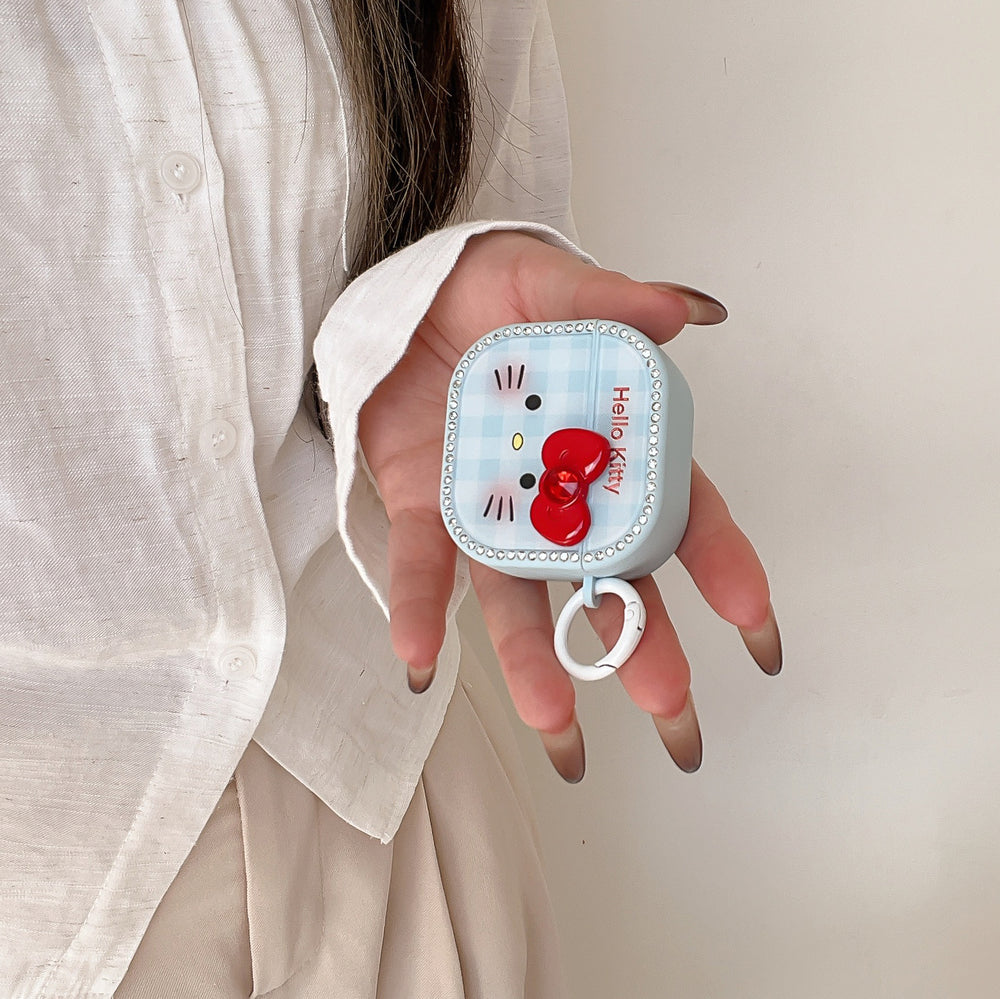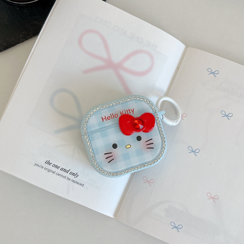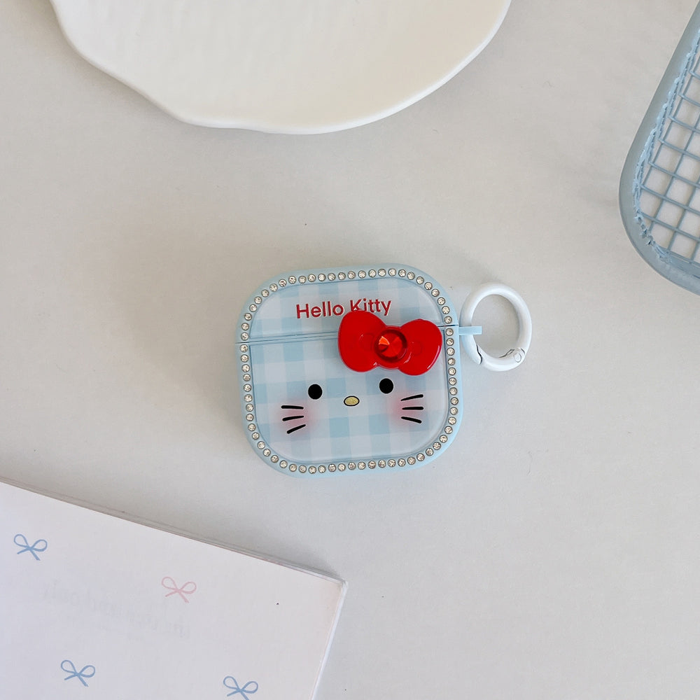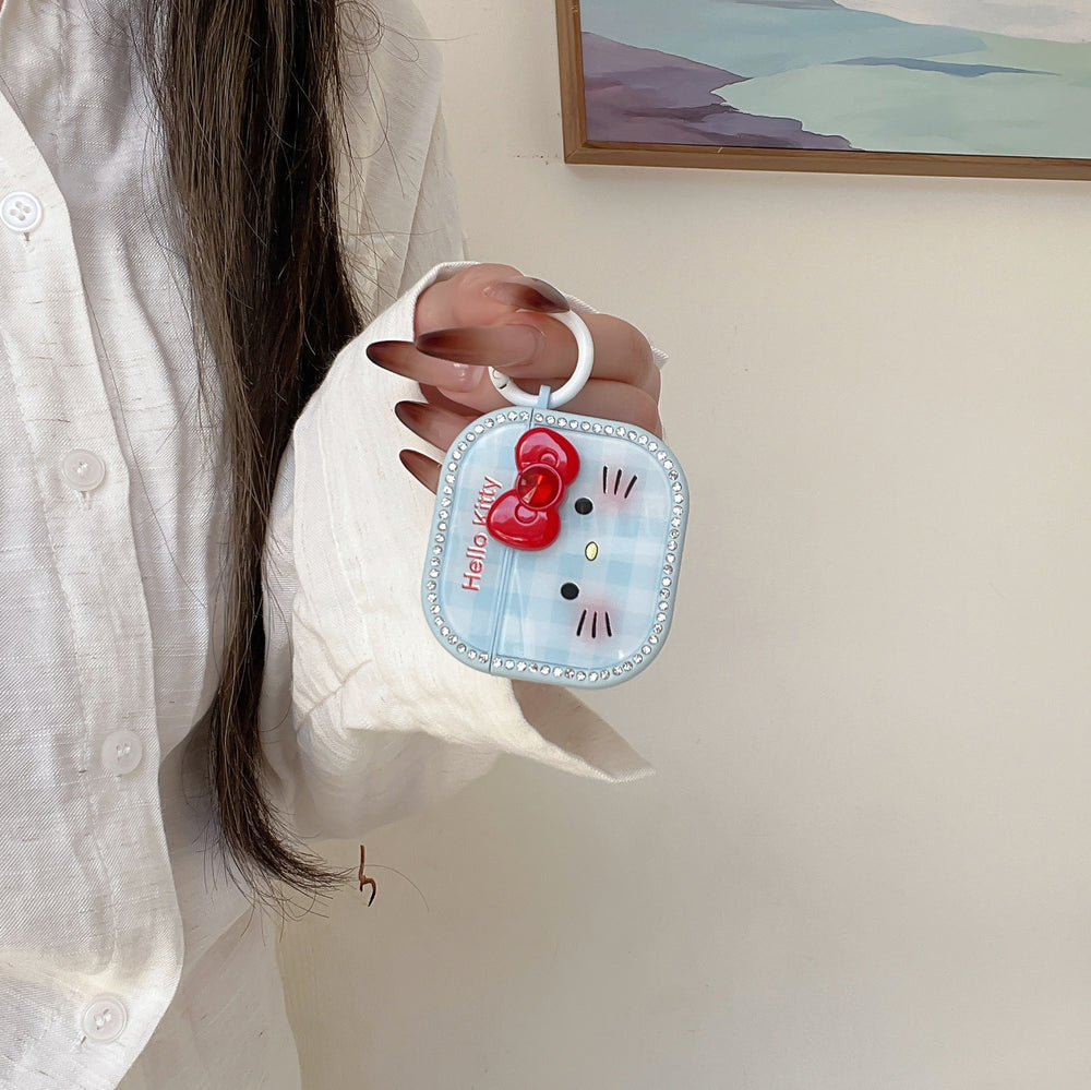 Blue plaid Kitty face magnetic rhinestone earphone case