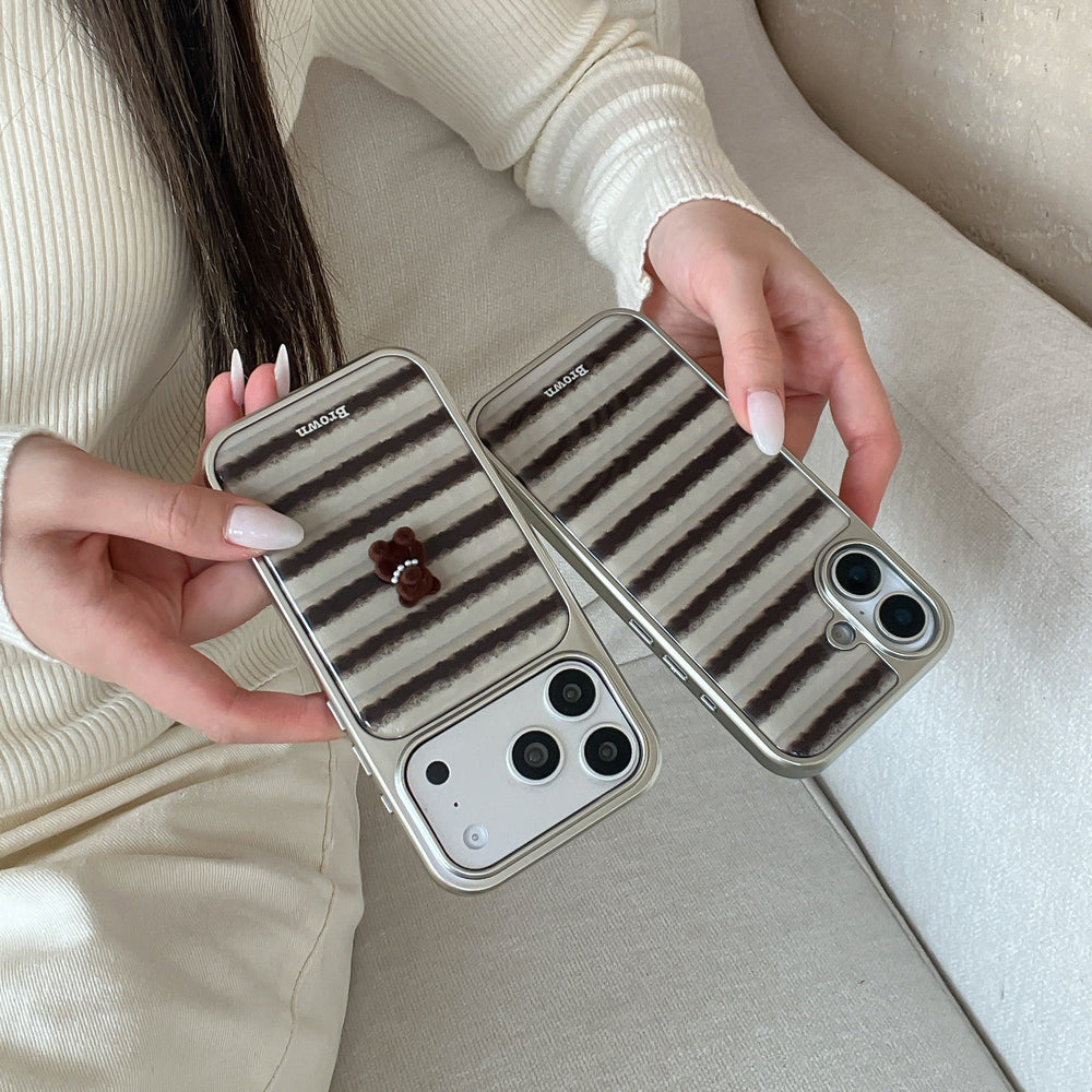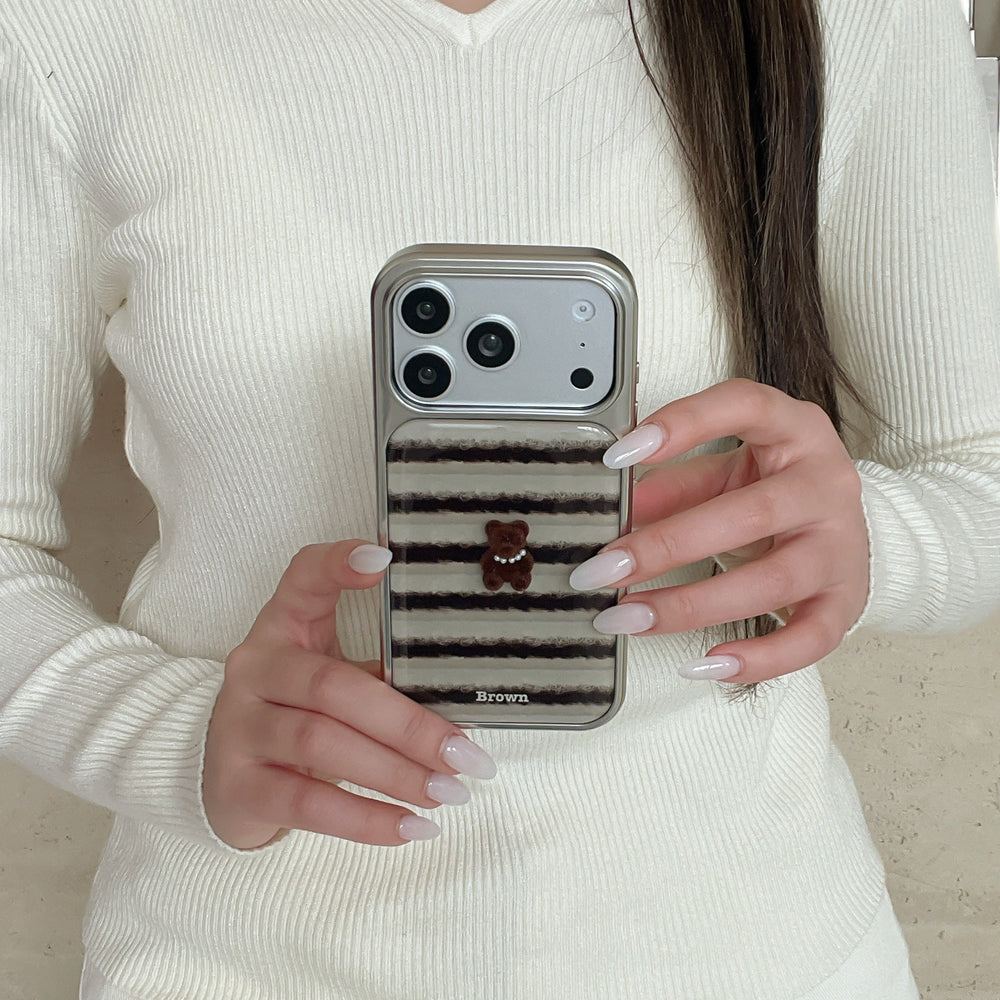 Striped 3D Pearl Bear Phone Case with Silver Edge